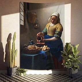 Johannes Vermeer, La Laitière, tapisserie murale représentant une femme versant du lait, nature morte de cuisine, panier à pain, peinture à l'huile vintage de l'âge d'or hollandais, décoration murale