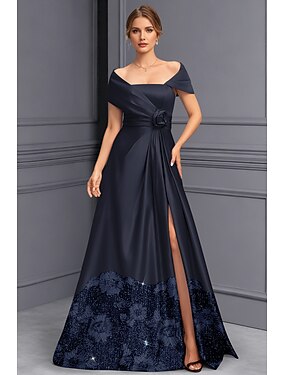 Ligne A Longueur au sol Broderie perlée Robe de Cérémonie Robe de la mère de la mariée Robe de Soirée Tenue de soirée Élégant Éclat Soyeux Manche Courte Épaules Dénudées Mariage Formel Capes Satin