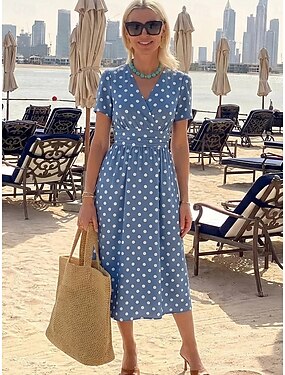 Femmes Robe Midi Robe d'Été Robe d'été Vacances Occasionnel Boho Quotidien Robe d'Été Robe de Printemps Coupe régulière Graphique À pois Manche Courte Col en V Bleu Été Printemps