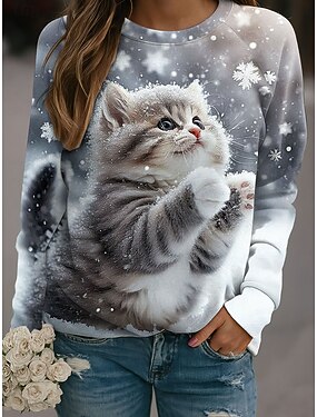 Femmes Pull Graphique Chat Occasionnel manche longue Col ras du cou Hauts Réguliers Occasionnel Bleu Violet Kaki Gris Automne Hiver