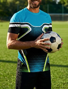 Maillot de football homme, col rond, manches courtes, mesh respirant, protection UPF50+, design géométrique dégradé bleu