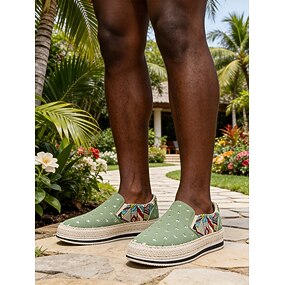 Mocassins en toile verte pour homme, à enfiler, avec motif décoratif, respirants et légers, idéaux pour les séjours en plein air, les voyages et le quotidien.