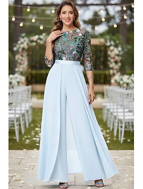 Combinaison Tailleur-Pantalon Trois Pièces Longueur au sol Robe de Mère de Mariée Manche 3/4 Col carré Élégant Formel robe demoiselle d honneur Chiffon Pailleté avec Paillettes Appliques