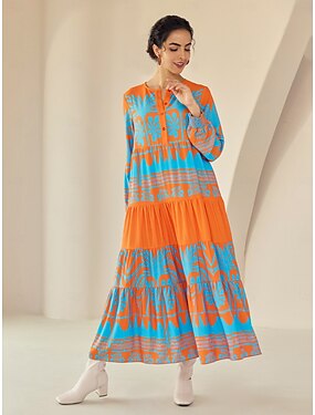 Robe longue décontractée ethnique à boutons linéaires et col ras du cou