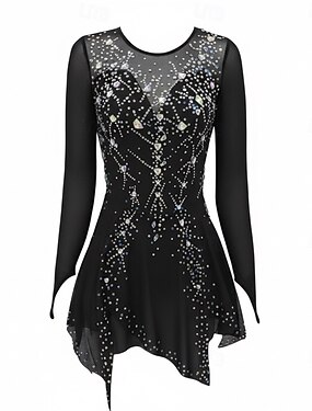 Robe de patinage artistique Femmes Patinage Robe Noir Patchwork Ourlet asymétrique Haute Élasticité Entraînement Compétition Tenue de Patinage Classique cristal pailleté manche longue Patinage sur
