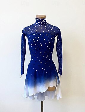 Robe de patinage artistique Femmes Fille Patinage Robe Bleu + Blanc Patchwork Ourlet asymétrique Spandex Maille Haute Élasticité Entraînement Compétition Tenue de Patinage Classique cristal pailleté