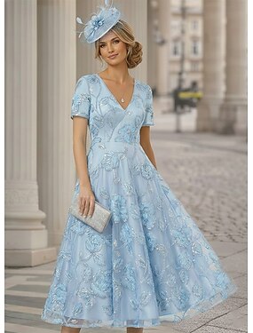 Ligne A Longueur thé Robe de Cérémonie Robes de Cocktail Élégant Manche Courte Col en V Mariage Formel Dentelle avec Fleur brodée Fleurs 3D Paillettes