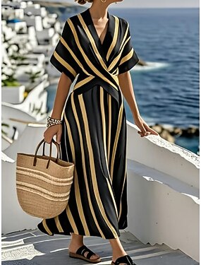 Femmes Robe Midi Robe trapèze Vacances Occasionnel Extérieur Sortir Coupe régulière Rayure Manche Courte Col en V Bleu marine Jaune Bleu Ciel Beige Été Printemps