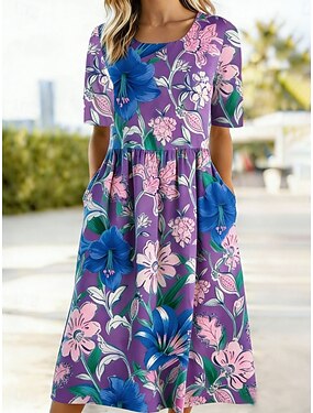 Femmes Robe Midi Robe fourreau Vacances Occasionnel Fête Coupe régulière Fleuri Graphique Manche Courte Col ras du cou Bleu Violet Été Printemps
