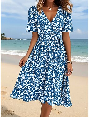 Femmes Robe Midi Robe trapèze Vacances Occasionnel Fête Date Coupe régulière Fleuri Graphique Manche Courte Col en V Bleu Vert Claire Rouge Violet Été Printemps