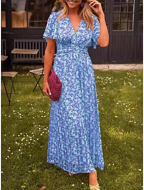 Robe maxi pour femmes robe en A robe d'été élégante vacances décontracté quotidien coupe régulière graphique floral ombré manches courtes col en V bleu été printemps automne