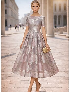 Ligne A Longueur thé Robes de Cocktail Robes pour invités de mariage Élégant Manche Courte Col Bateau Fête de jardin Formel Jacquard avec Imprimé floral Imprimé