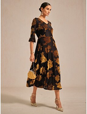 A-Line Robe de Fête Longueur Thé Robe Cocktail Robe d'Invité de Mariage Mère de la Mariée Manches Mi-Longues Col Roulé Élégante Vintage Fête avec Paillettes Blocs de Couleur