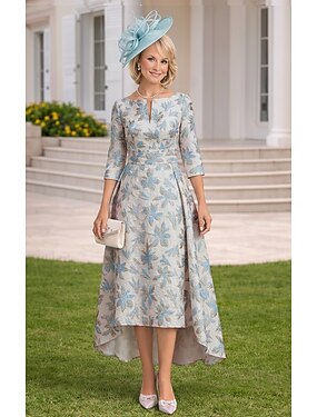 Ligne A Robe haute-basse Longueur thé Robe de Soirée Robe de Cocktail Robe d'invité de mariage Robe de Mère de Mariée Manche 3/4 Col en V Col Bateau Élégant ancien Formel Jacquard avec Plis