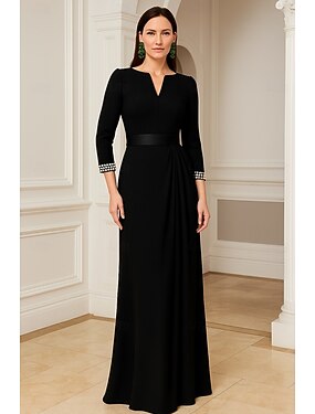Ligne A Longueur au sol Robes de Cocktail Robe de Soirée Tenue de soirée Élégant ancien Robe Noire manche longue Col en V Formel robe demoiselle d honneur Crêpe Extensible avec Plis
