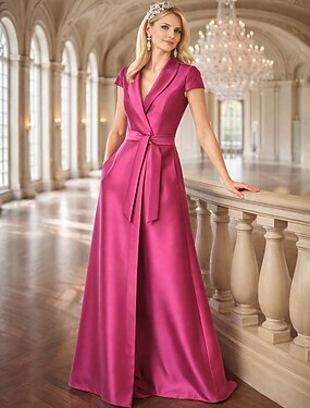 Ligne A Longueur au sol Robe d'invité de mariage Robe de Cérémonie Robe de soirée Robe de Mère de Mariée Manche Courte Revers Élégant ancien Mariage Formel Satin avec Noeud(s) À Bretelles