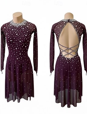 Robe de Patinage Artistique Femme Fille Patinage Robes Pourpre foncé Patchwork Dos ouvert Maille Haute élasticité Entraînement Compétition Tenue de Patinage Classique Cristal / Stras manche longue
