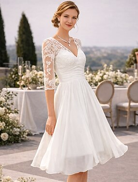 Ligne A Mi-long Robes de mariée Robes pour enterrement de vie de jeune fille robe de mariée Petites Robes Blanches Demi Manches Col en V Remise des Diplômes Anniversaire Chiffon Dentelle avec Drap
