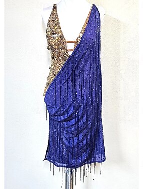 Robe de danse latine pour femme, tenue de performance asymétrique drapée en strass, dorée et bleue, pour compétition de rumba, cha cha paso doble