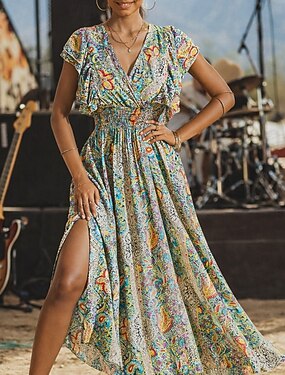 Bohème Rétro Vintage Boho Longueur au sol Robe Paisley Bohème Col en V Déguisement Femmes Mascarade Festival de Musique Soirée à thème rétro Adulte Robe Été