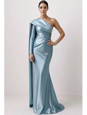 Fourreau Colonne Longueur au sol Robe de bal avec cape Robe de Soirée Tenue de soirée Élégant Soyeux manche longue Une Épaule Mariage Formel Capes Satin avec Plis
