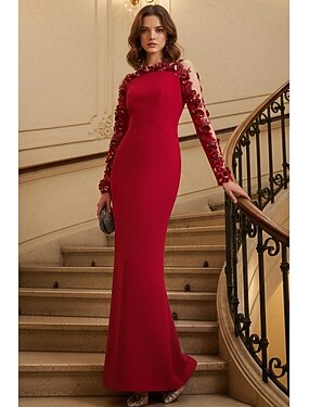 Robe fourreau colonne longueur de sol Robe formelle Robe de soirée Robe de soirée élégante vintage à manches longues encolure bateau pour bal soirée avec fleurs brodées perles et sequins