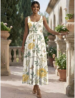 Femmes Robe maxi Robe trapèze Vacances Occasionnel Extérieur Sortir Coupe régulière Fleuri Graphique Sans manches Col en V Jaune Été Printemps