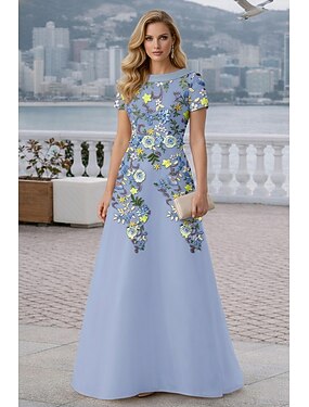 Ligne A Longueur au sol Robe de Mère de Mariée Demi Manches Col Illusion Col Rond Élégant ancien Formel robe demoiselle d honneur Soirée Formelle Chiffon Organza Jacquard avec Fleur