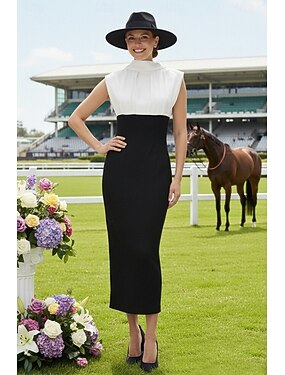 Robes cocktail fourreau Élégante Robe Invitée de mariage Tenue de travail Longueur genou Manches longues Col haut Spandex avec plis et volants Robes