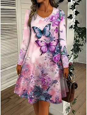 Robe Mini Femme Col Rond Manches Longues Robe Décontractée Robe T Shirt Robe Tee Robe A Ligne Robe Décontractée Coupe Regular Graphique Florale Papillon Rose Bleu Orange Vert Printemps Automne Hiver