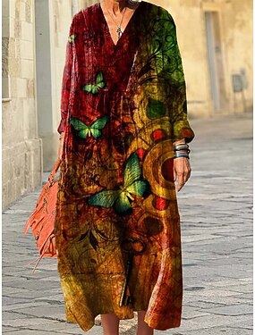 Femmes Robe Longue Maxi Robe Robe bohème Robe Vintage Robe Décontractée ancien Quotidien Extérieur Vacances Coupe régulière Fleuri manche longue Col en V Vin Printemps Automne