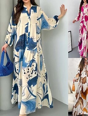 Femmes Robe maxi Robe fourreau Vacances Occasionnel Extérieur Sortir Coupe Ample Fleuri manche longue Col Rabattu Bleu Jaune Fuchsia Vert Été Printemps Automne