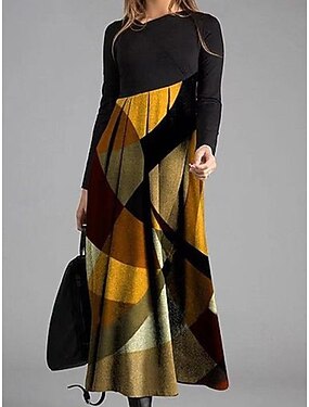 Femmes Robe Midi Robe trapèze Occasionnel Quotidien Coupe régulière Graphique Géométrique Bloc de Couleur manche longue Col en V Bleu Marron Sapin Jaune Marron Printemps Automne Hiver