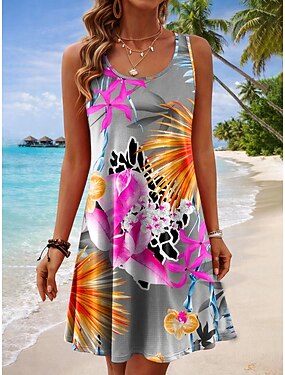 Femmes Mini Robe Robe d'Été Robe trapèze Robe d'été Vacances Occasionnel Boho Plage Soirée Mariage Coupe régulière Graphique Tropical Sans manches Col en U Bleu Violet Vert Gris Été Printemps