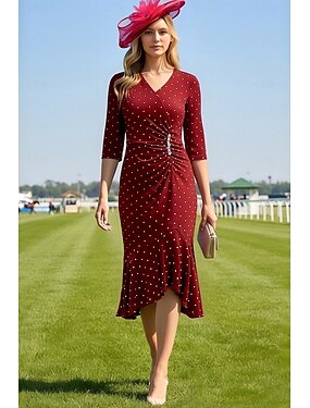 Robe de fête longueur thé asymétrique trompette sirène robe de cocktail robe invitée mariage robe mère de la mariée manches longues décolleté en V élégante vintage avec plis et perles