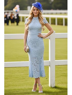 Fourreau Colonne Longueur thé Robe de Soirée Robe de Cocktail Robe d'invité de mariage Robe de Mère de Mariée Manche Courte Col ras du cou Élégant ancien Formel Dentelle avec Broderie Fleur Couleur