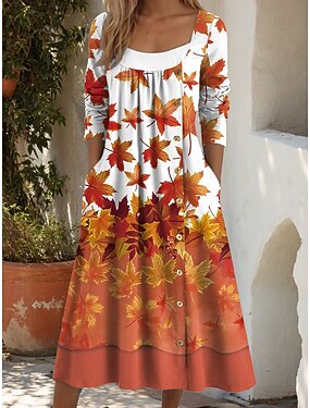 Femmes Robe Midi Robe fourreau Robe trapèze Occasionnel Quotidien Coupe régulière Graphique Feuille manche longue Col carré Jaune Orange Marron Automne Hiver