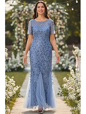 Sirène Trompette Longueur au sol Broderie perlée Robe d'invité de mariage Robe de Cérémonie Robe de Mère de Mariée Manche Courte Col ras du cou Élégant ancien Fête Formel robe demoiselle d honneur