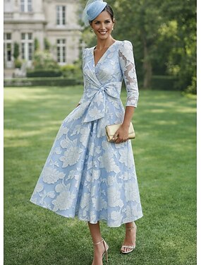 Ligne A Longueur cheville Longueur thé Robes de Cocktail Élégant ancien Floral manche longue Col en V Fête de jardin Formel Poche Satin Dentelle avec Imprimé floral Noeud(s) Plis