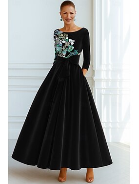 Ligne A Longueur au sol Broderie perlée Robe de Cérémonie Robe de la mère de la mariée Robe de Soirée Tenue de soirée Élégant ancien Manche 3/4 Col ras du cou Mariage Formel Poche Velours avec