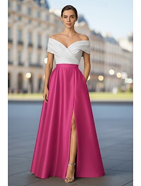 Ligne A Longueur au sol Robes de Bal Robe de Soirée Tenue de soirée Élégant Bloc de Couleur Fente Haute Demi Manches Col en V Mariage Formel Satin Satin Extensible avec Noeud(s) Plis