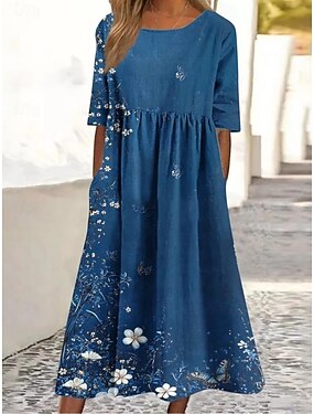 Robe Midi Femme Boho Robe de Plage Robe Vintage Robe Ethnique Robe en Chiffon Élégante Vacances Vintage Vacances Coupe Régulière Florale Manches Courtes Col V Bleu Été Printemps