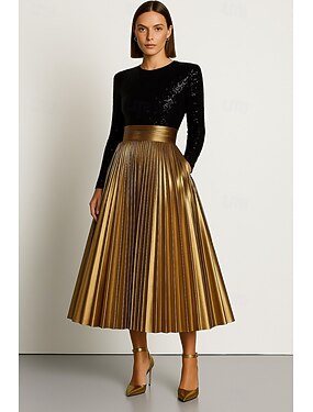 Ligne A Longueur thé Robes de Cocktail Robes de soirée Élégant manche longue Col ras du cou Fête de jardin Mariage Pailleté avec Plis