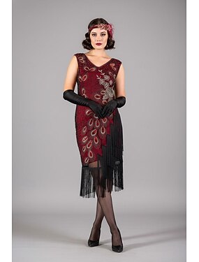 Années Folles Années 1920 Mi-long Robe Robe Charleston Tenues Sans manches Gatsby le Magnifique Charleston Grande Taille Frange à pompons Plume Col en V Déguisement Femmes Carnaval Nouvel An Mascarade