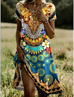 Femmes Robe Midi Robe bohème Robe d'Été Robe Décontractée Robe Ethnique Élégant Bohème Vacances Plage Fête Date Coupe Ample Fleuri Graphique Manche Courte Col en V Bleu Rose Claire Violet Vert Ét