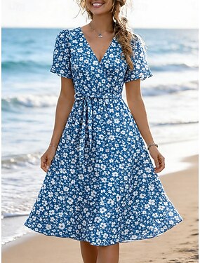 Femmes Robe Midi Robe Décontractée Robe trapèze Élégant Vacances Mignon Fête Date Coupe régulière Fleuri Graphique Manche Courte Col en V Bleu Jaune Rose Claire Violet Été Printemps Automne Hiver