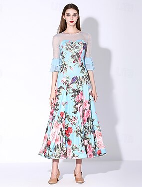 Ligne A Longueur au sol Robe d'invité de mariage Robe de Cérémonie Robe à Volants Robe de Mère de Mariée Demi Manches Col ras du cou Élégant robe demoiselle d honneur Fête de fiançailles Chiffon avec