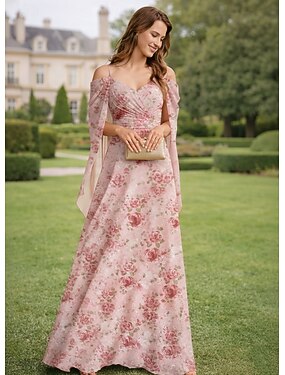 Ligne A Longueur au sol Robe d'invité de mariage Robe de Cérémonie Robe Évasée Robe de Mère de Mariée Manche 3/4 Col en V Élégant ancien Pastel Formel Chiffon Jacquard avec Fleurs 3D Volants