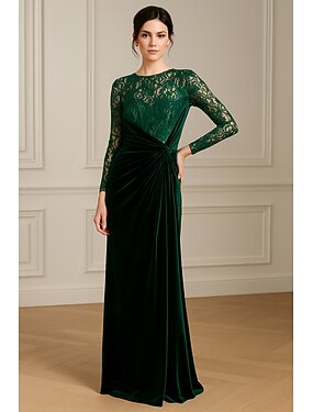 Fourreau Colonne Longueur au sol Robes de Bal Robe de Soirée Tenue de soirée Élégant Robe Noire Soyeux manche longue Col Illusion Mariage Formel Dentelle Velours avec Plis