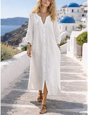 Femmes Robe maxi Faux coton lin Robe fourreau Robe Chemise Robe Blanche Élégant Basique Occasionnel Manches Bouffantes Quotidien Maison Travail Coupe Ample Uni manche longue Col en V Blanche Ét